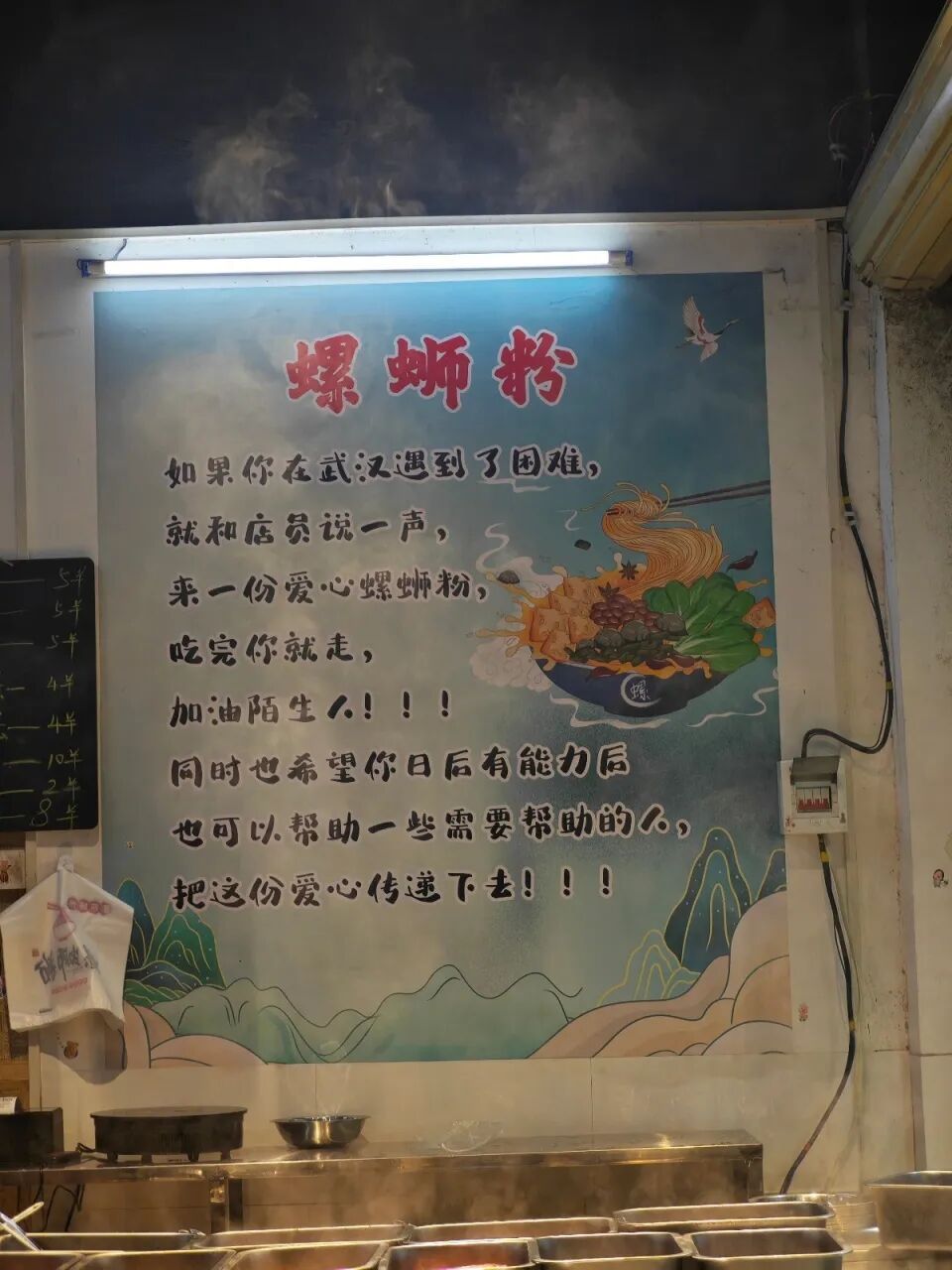 “如果你在武汉遇到了困难,就和店员说一声,来一份爱心螺蛳粉,吃完你就走,加油陌生人。同时也希望你日后有能力后,也可以帮助一些需要帮助的人,把这份爱心传递下去。”近日,湖北武汉市一市民向九派新闻反映,其在硚口区一家螺蛳粉店看见爱心标语,为此感动。